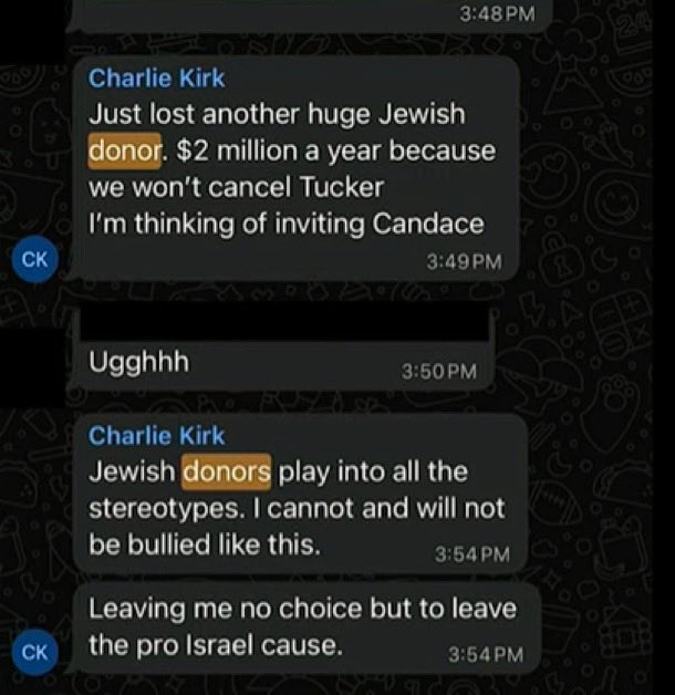 In the chat Charlie Kirk said "Just lost another huge Jewish donor. $2 million a year because we won't cancel Tucker" talking about Tucker Carlson, he later concluded with "leaving me no choice but to leave the Pro-Israel cause"