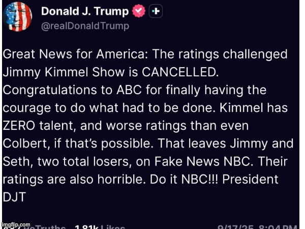 Trump made comments about Jimmy Kimmel getting fired on his social media Truth Social