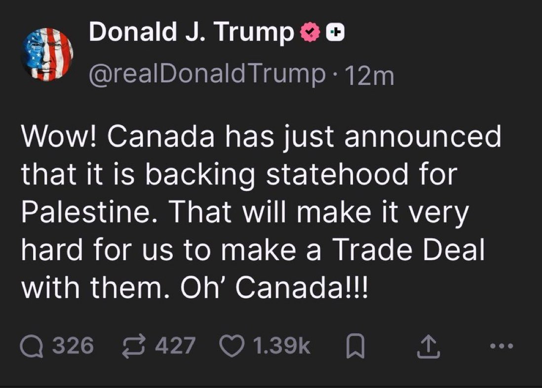 “Wow! Canada has just announced that it is backing statehood for Palestine. That will make it very hard for us to make a Trade Deal with them. Oh’ Canada!!!”